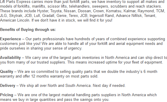 All our lift truck parts are obtainable at the best prices. Give us a phone call now if you are interested in getting a price quote on our attachments or parts. Call us at: